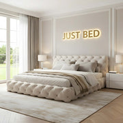 - The bed in the main image is upholstered with cream plush velvet fabric.