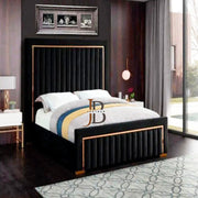 The Eli Upholstered Linestyle Bed with Golden Border has a simple fabric design with lines, and the golden border adds...