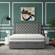The Dundy bed is a classically styled piece featuring an impressive, chesterfield headboard with luxurious diamond button tufting upholstered in a stylish mid-gray fabric. The bed rests on a practical divan ottoman storage base in a deeper gray, which integrates two functional storage compartments for smart storage. This design seamlessly combines a sophisticated, traditional look with modern utility.