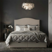 The Edison bed features an understated and elegant design with a substantial, rectangular headboard that has softly rounded upper corners. The headboard is fully upholstered in a smooth, light beige or taupe fabric with clean, unadorned tailoring.