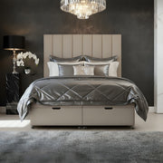 The Salvatore bed embodies sleek, modern luxury with its tall, rectangular headboard featuring tailored vertical channeling in a soft, neutral...