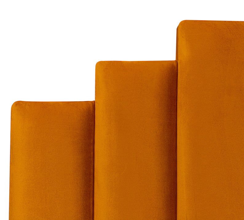 The Kent Art Deco Headboard features a sophisticated, stepped silhouette, channeling the grandeur of classic 1920s design. Upholstered in a luxurious, deep amber or rust-colored velvet, it creates a warm, inviting focal point with undeniable vintage charm.