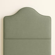 The Polish Luxury Headboard features a gracefully rounded, camel-back silhouette for a timeless, elegant look. Upholstered in a refined, muted sage-green fabric, its simple, clean design and subtle horizontal piping offer a sophisticated yet understated touch of luxury to any bedroom decor.